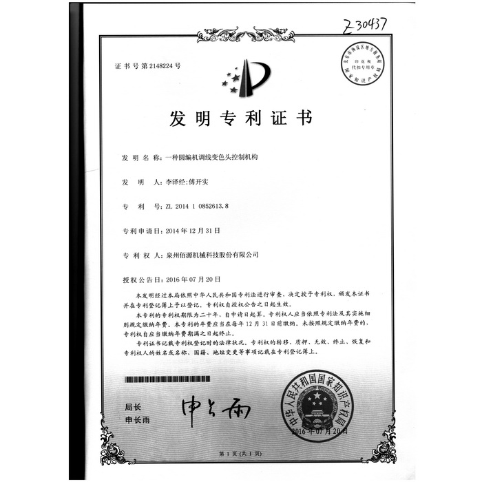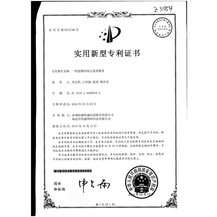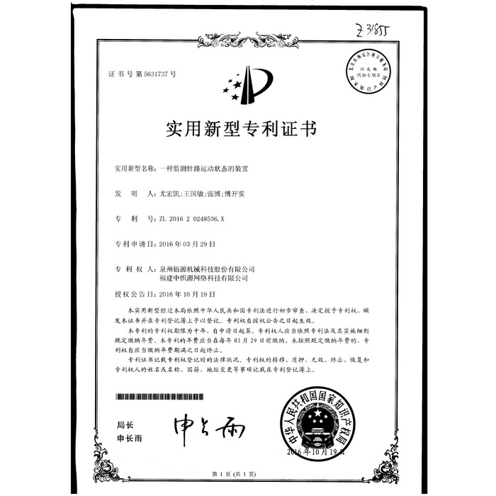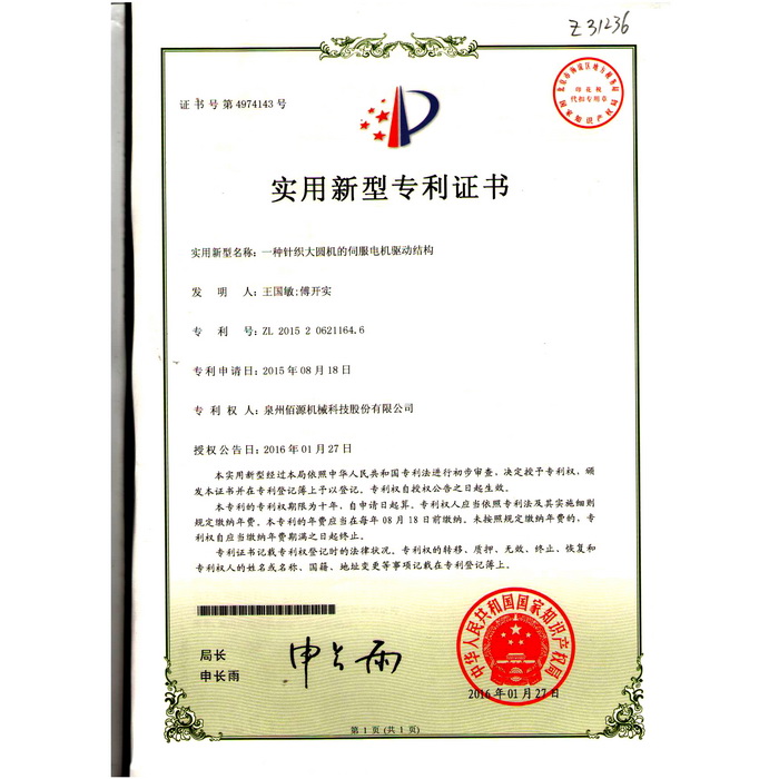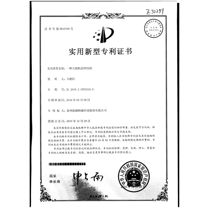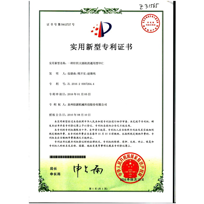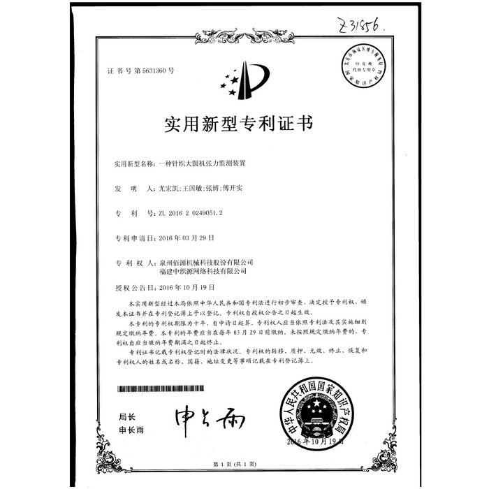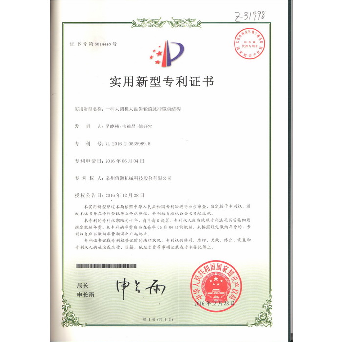 新型-泉州佰源機(jī)械科技股份有限公司 一種大圓機(jī)大盤齒輪的脈沖微調(diào)結(jié)構(gòu) 實(shí)用新型專利證書